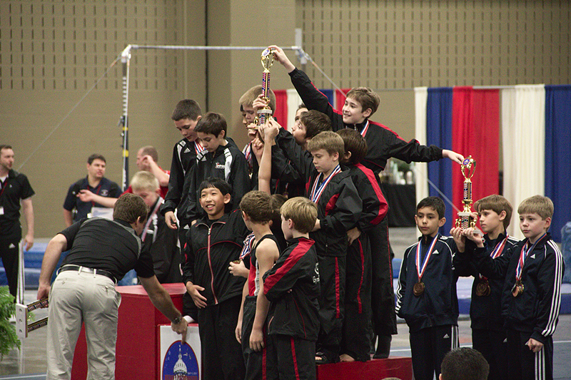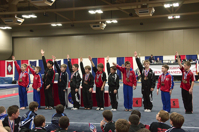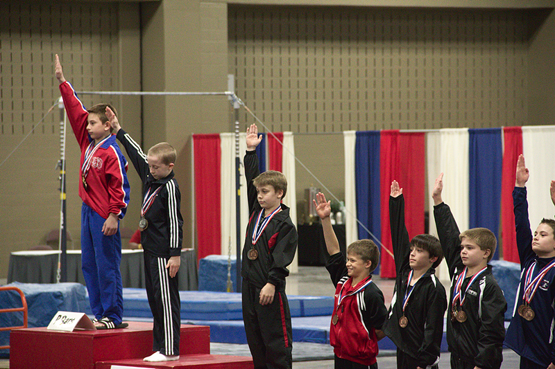 Justus competed hard, and ended the season tieing his season high All-Around (88.4) from State Championships. At Regionals he tied for 1st on Rings, 3rd on Parallel Bars and 4th on High Bar, and was awarded 6th in the All-Around. By being in the top twelve in Level 7 (all ages combined), Justus automatically becomes a member of the Level 7 Junior Regional Development Team. The Development Team will have the unique opportunity to work out at a week-long summer camp on Oklahoma University’s campus in Norman. He will live in a campus dorm, eat dorm food (eh…), work out with top-flight athletes in the OU facilities, and receive special coaching and attention.